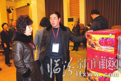 图为郭小安(右)向参会人员推介“壶口牌”苹果。