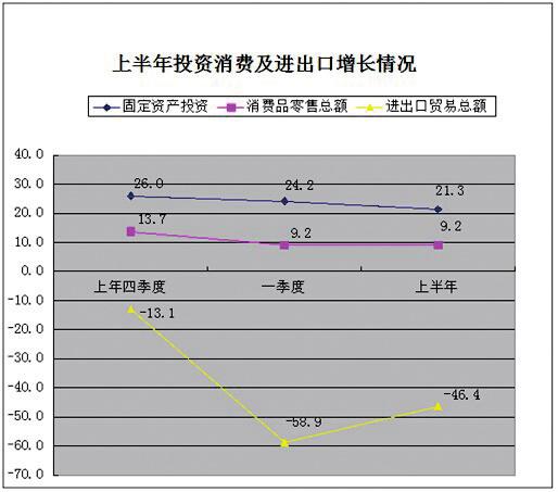 实际情况是,今年上半年,只有固定资产投资达到了应有的增长速度,社会消费品零售总额增速欠3.3个百分点,进出口增速欠62个百分点。下半年,面临的下行的压力依然较大,形势异常严峻。要完成年度目标任务,必须确保固定资产投资增速保持在22%以上,以弥补消费增长的不足,特别是进出口下降对全市经济负面影响;社会消费品零售总额在保持稳定增长的基础上,要尽快提速,恢复两位数增长;海关进出口总额增速要力争扭负为正,尤其是进口总额下降幅度要比上半年有明显收窄。 通讯员 苏彩凤