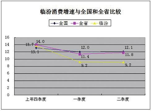 不利之一:今年社会消费品零售总额增长速度均低于全省和全国,稳定性相对较差,增速排全省末位。上半年,临汾全社会消费品零售总额增长9.2%,增速比全省平均增速低2.6个百分点,差距比一季度扩大0.4个百分点,比上年四季度扩大2.3个百分点;与全国增速相比,上半年比全国增速低2.9个百分点,差距比一季度扩大0.1个百分点,比上年四季度扩大2.3个百分点。与上年四季度相比,临汾全社会消费品零售总额增长速度回落4.5个百分点,大于全省回落幅度3.5个百分点,大于全国回落幅度2.3个百分点,消费增长稳定性相对较差。在全省11个市排位中,上半年临汾全社会消费品零售总额增速排倒数第二,压力巨大。