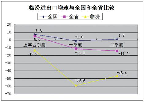 不利之二:临汾海关进出口下降幅度较大,与全省和全国相比,存在较大差距。从下图可以看出,前三个季度,临汾进出口均呈负增长,明显低于全省和全国增速。上半年,进出口总额同比下降46.4%,虽然比一季度明显收窄,在全省11个地市排位中由一季度的第10位,前移到第九位,但差距依然较大,与排在第一位的晋中市相差83.8个百分点。