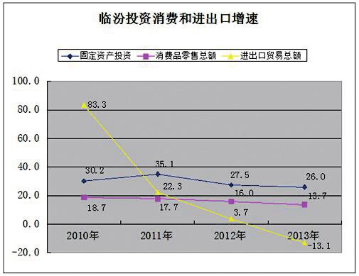 投资“马车”动力充足,增速趋于放缓。数据显示,临汾固定资产投资增长速度一路领先,明显高于消费品零售额增长速度,有力地推动了全市经济平稳较快增长。2011年至2013年,临汾固定资产投资额分别比上年增长35.1%、27.5%和26%,虽然动力充足,但增速有逐渐放缓迹象。