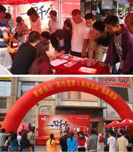 秋高气爽,晋城银行寻找追梦人系列活动《 “一句千金“老板金句有奖大推荐》商圈巡演持续在龙城举行。商圈巡演的第二站在太原中部商圈大南门富百家、第三站在太原南部商圈和信摩尔广场连续举行,伴随着双节的来临,晋城银行太原分行为省城太原的追梦人再次吹响追梦的号角。