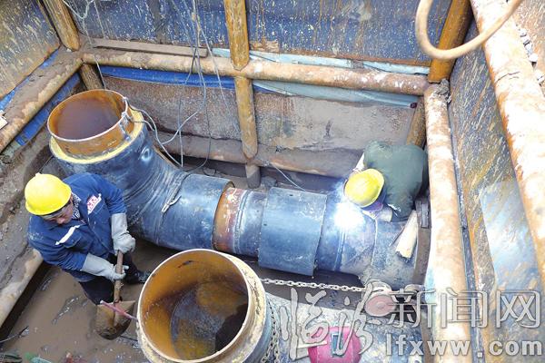 11月10日,在市区滨河东路辅路五一西口至规划五路(南北联通工程)施工现场,供热工人正在加紧施工,力争本月15日完工。记者 陈华 摄