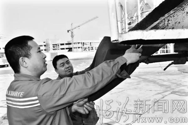 临汾新闻网讯 临汾华基混凝土公司是我市规模最大、现代化程度最高的混凝土生产企业,近年来,该公司持续投入专项资金,确保混凝土运输车辆在市区通行时无抛洒、无滴漏,有效维护了城市环境卫生。图为工作人员正在为车辆的出料口加装环保布袋。 记者 柴云祥 摄