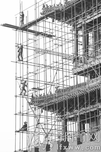 临汾新闻网讯 12月26日,在我市鼓楼,工人师傅正在安装灯饰进行亮化,预计灯具安装将于春节前夕完成并进行调试。
