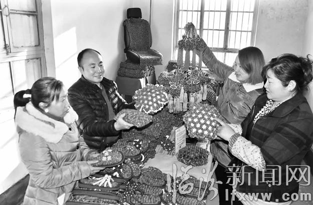 临汾新闻网讯 近日,在隰县弘盛源山核桃加工专业合作社,工人们正在加工山核桃工艺品。该合作社以山核桃为原材料,纯手工编织汽车坐垫、按摩枕头、拖鞋、挂件等系列编织产品,安置了100余名农村剩余劳动力就业,增加了农民收入。