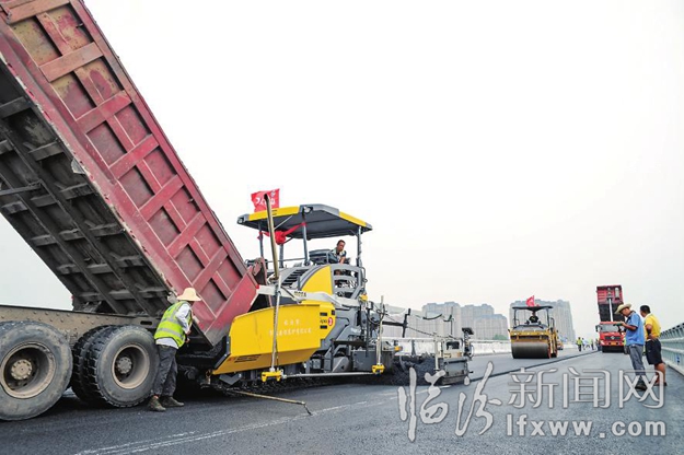 图为施工人员正在进行滨河西路主线高架桥上面层沥青混合料摊铺工作。记者 郑远飞 摄