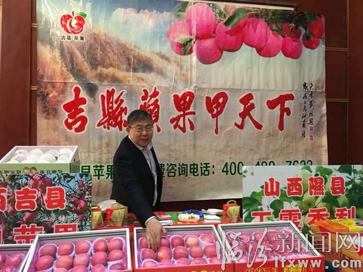 在会场出入口的必经之地,一块以壶口瀑布为背景,题有“吉县苹果甲天下”的喷绘展板格外醒目;展板下方,整齐码放熠熠生辉的正是山西地方名优特产的代表性品牌——吉县壶口苹果和隰县玉露香梨。