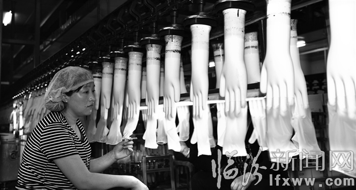 临汾新闻网讯 山西鸿晋塑胶科技有限公司年产40亿只一次性防护手套项目,占地300亩,总投资11.9亿元,项目分两期建设。全部建成后,可提供2300个就业岗位,带动贫困劳动力转移就业。图为工人们正在加工一次性防护手套。