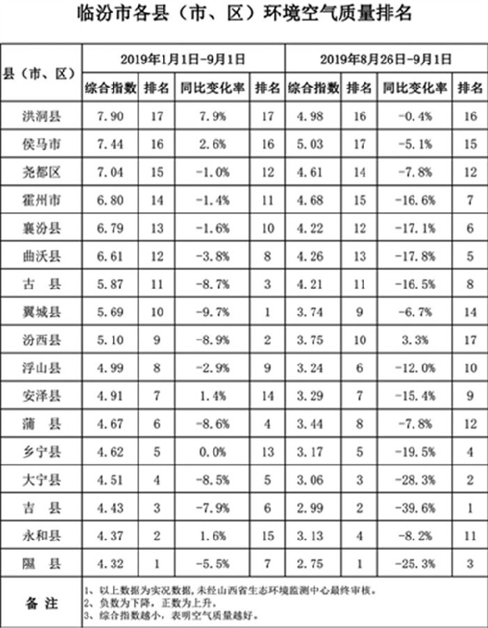 1、以上数据为实况数据,未经山西省生态环境监测中心最终审核。 2、负数为下降,正数为上升。