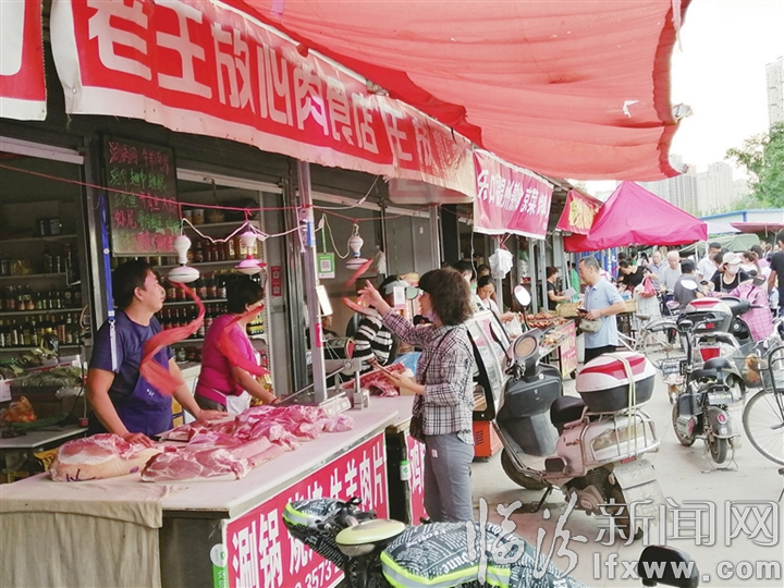 市民在西王农贸市场购买猪肉。