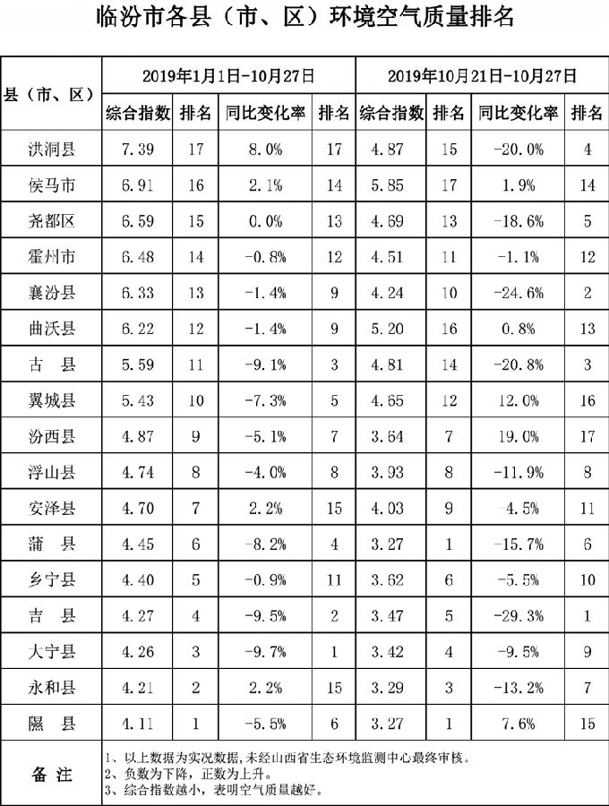 1、以上数据为实况数据,未经山西省生态环境监测中心最终审核。 2、负数为下降,正数为上升。