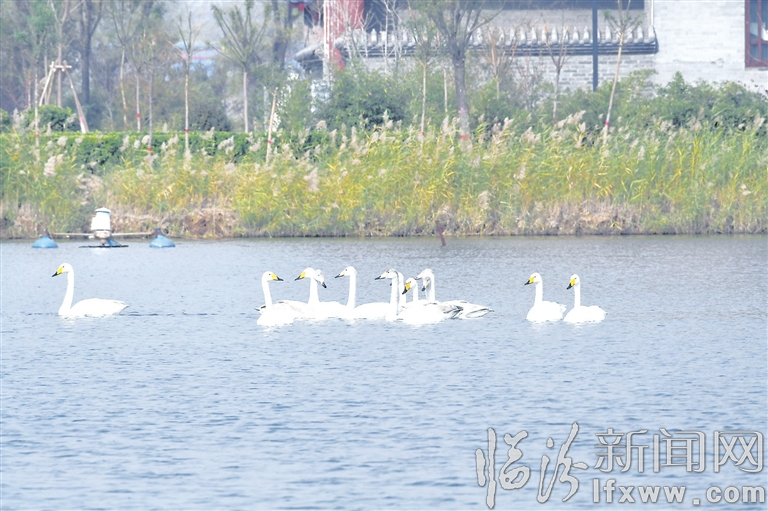 图为11月12日,10余只天鹅在太子湖游弋。