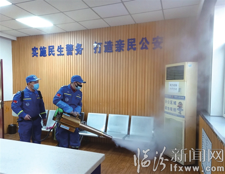蓝天救援队的志愿者为派出所进行消杀作业 记者 卢婷 摄
