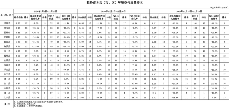 临汾市各县(市、区)环境空气质量排名