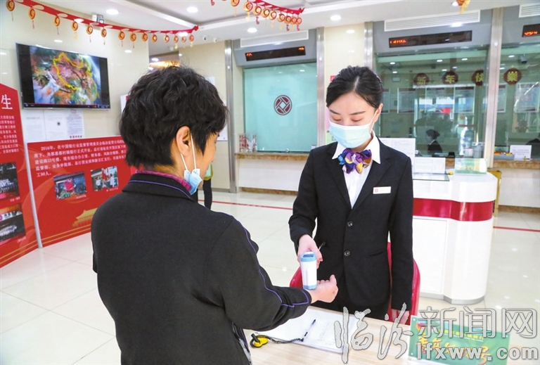 2月14日,正月初三。中午12时许,记者走进位于市区鼓楼北大街和向阳路十字路口西南侧的中国银行营业厅。大厅四周的墙壁上,悬挂着火红的中国结、红灯笼和精美的镂空“福”字,满满都是浓郁的春节氛围。