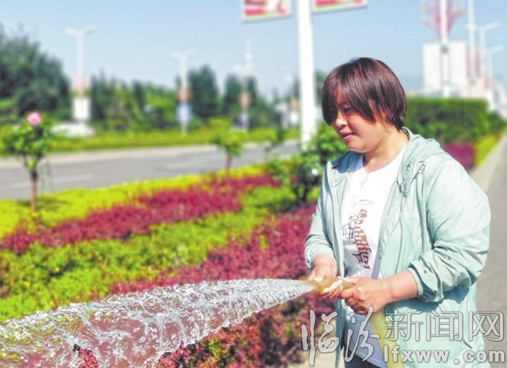 那个正拖着长长的水管向几丛月季花浇水的人,就是市园林事业发展中心二中队副队长荆冰。