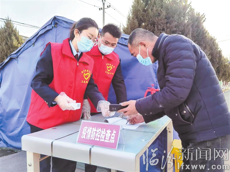 临汾新闻网讯 学雷锋纪念日前夕,国家税务总局安泽县税务局青年党员先锋队深入社区、乡村开展“青春战‘疫’ 志愿有我”学雷锋志愿服务活动。图为税务志愿者协助社区、乡村工作人员查验健康码、检测体温。(张博一 摄 )