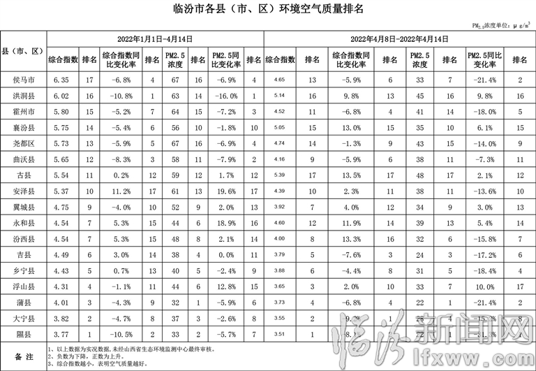 备 注 1、以上数据为实况数据,未经山西省生态环境监测中心最终审核。 2、负数为下降,正数为上升。 3、综合指数越小,表明空气质量越好。