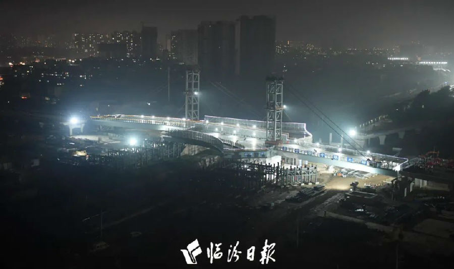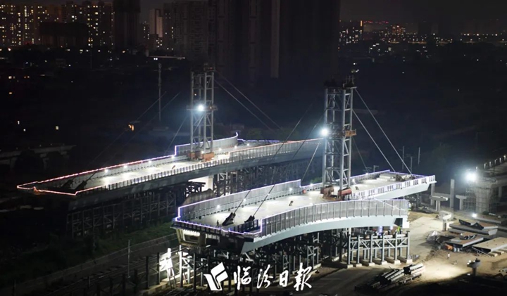 7月2日21时,河汾一路跨铁路桥主桥左、右两幅异形钢箱梁开始缓缓转动,23时,两幅钢箱梁“比翼双飞”跨越南同蒲铁路,实现同步转体精准就位,整个转体过程用时120分钟。