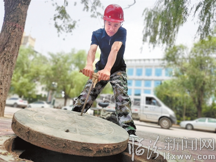 7月9日下午,记者在市区河汾路看到正在逐个检查管道井的任林伟,灼热的高温下,他的衣服已经被汗水浸得湿透。