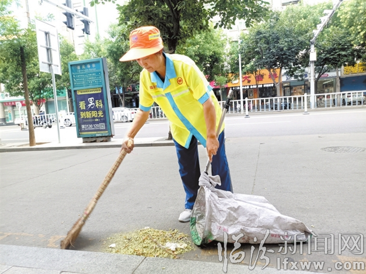 7月9日14时50分,记者在市区平阳北街看到,环卫工人周腊云正在清扫掉落在路面的槐花。天气很热,汗水淌满了脸庞,她依旧顶着烈日坚定前行。