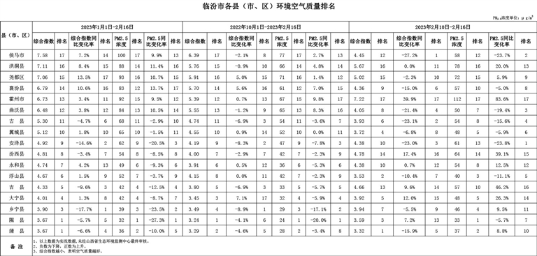 1、以上数据为实况数据,未经山西省生态环境监测中心最终审核。 2、负数为下降,正数为上升。3、综合指数越小,表明空气质量越好。