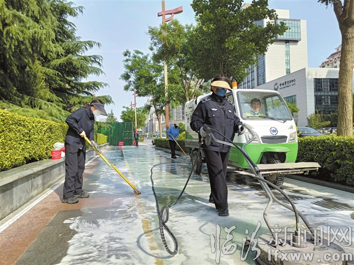 临汾新闻网讯 为减少道路扬尘污染,市城市管理局不断加大道路保洁清洗力度,并结合市大气污染防治行动指挥部办公室调度指令,适时调整保洁频次,全力保障城市道路环境干净整洁。图为5月8日,环卫工人在清洗市区向阳西路人行道路面。