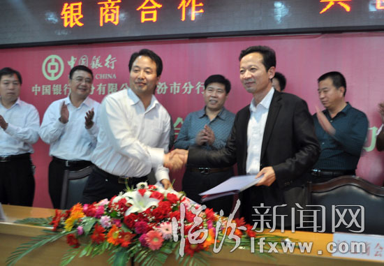 中国银行临汾分行行长王智勇(左)与临汾市河北商会会长牛岷(右)互交协议