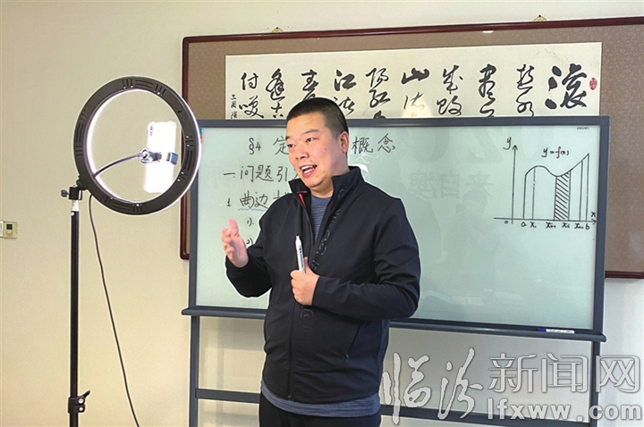 临汾新闻网讯 3月9日,山西师范大学现代文理学院数学系的老师在“空中课堂”上课。疫情期间,山西师范大学现代文理学院打造了高效“空中课堂”,通过配备专业的直播支架、灯光及白色书写板,以认真负责的态度,提高线上教学效果,达到停课不停学,停课不停教的目的。