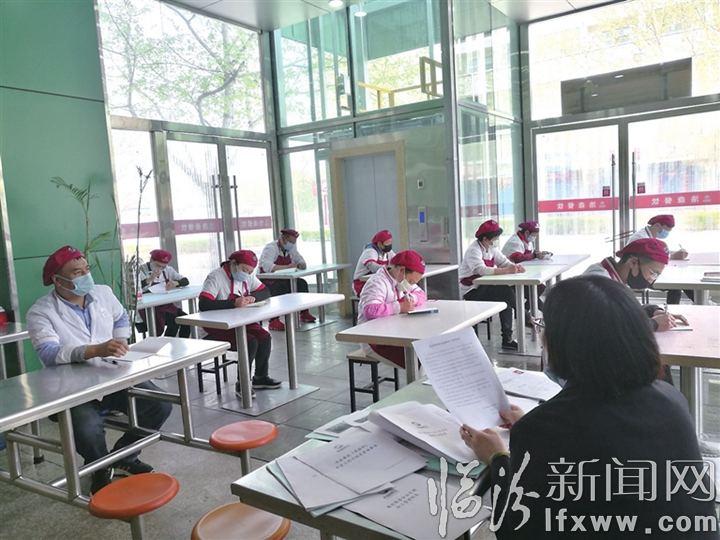 临汾新闻网讯 依据省委和教育厅的安排部署,山西师范大学文理学院即将迎来毕业年级开学的日子。为此,该校进行了精心准备,做好开学预案。图为后勤保障部对餐厨工作人员进行岗前培训的情景。