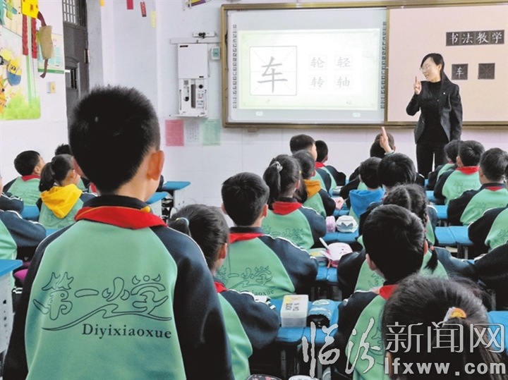 3月23日,襄汾县第一小学举办了第五届“书法进校园”活动。通过观摩、展示和交流等方式,把书法的种子种进了孩子们的心田。图为老师正在给孩子上硬笔书法课。