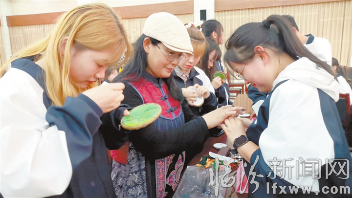 临汾新闻网讯 4月26日下午,“领略三晋瑰宝 传承‘晋派’工艺”——“晋派”工艺进校园活动走进临汾职业技术学院,现场通过艺术理论讲座、技艺作品展示、技能现场互动等形式让学生们更好地了解非遗、热爱非遗、传承非遗。图为该院的学生正在跟非遗传承人学刺绣。