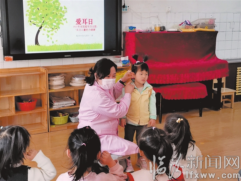 临汾新闻网讯 3月3日是第23个“全国爱耳日”,许多幼儿园举办了形式多样的活动,让孩子们了解爱耳的重要性,帮助他们养成良好的用耳习惯。图为市幼儿园老师正在教幼儿如何保护耳朵。