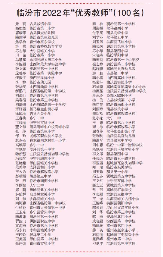 中共临汾市委教育工作领导小组关于命名全市2022年度“优秀教师、优秀校(园)长、优质学校(幼儿园)”的通报