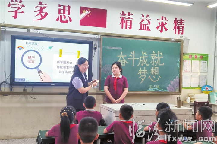 临汾新闻网讯 日前,市第二小学以“努力奋斗筑梦想,时代少年向未来”为主题开展思政第一课,引导学生树立正确的人生观、价值观。图为思政课上老师与学生互动。