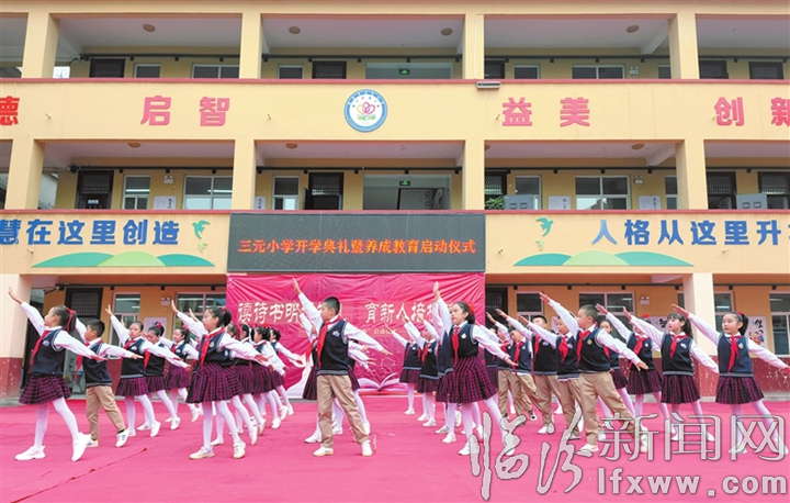 9月9日上午,尧都区三元小学师生齐聚操场,举行了“读诗书明德知礼,育新人培根铸魂”开学典礼暨养成教育启动仪式。图为五年级学生表演的礼仪小剧。