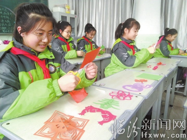 图④为临汾市逸夫育英小学六(3)班的学生正在体验剪纸。
