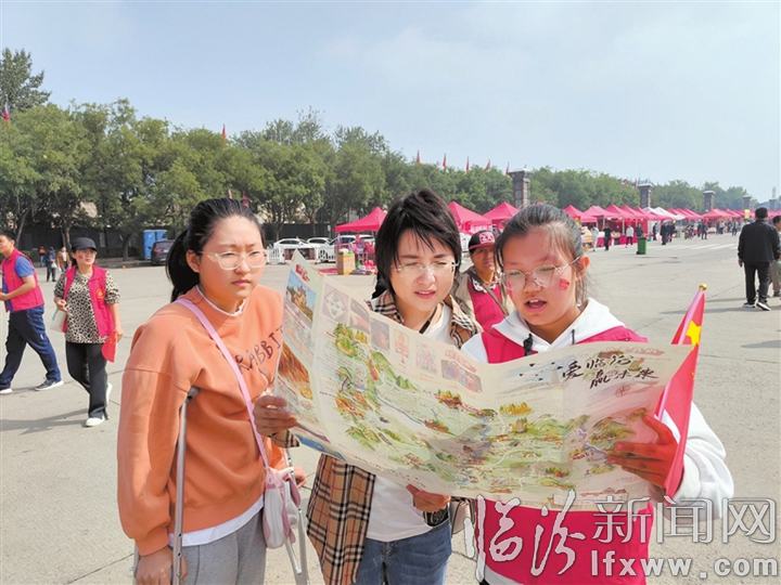 临汾新闻网讯 近日,临汾四中组织开展“游三晋·推介家乡——感受山西生态环境美如画”美术实践活动,通过绘制家乡旅游线路图等,推荐家乡临汾。图为10月3日,该校学生在尧庙、华门景区向游客介绍临汾美景。本网记者 摄