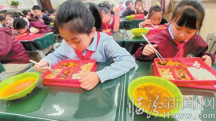 自今年秋季学期起,我市在一些学校试点推出午间托管服务,其中的“放心午餐”服务广受家长好评。图为临汾市第二小学学生正在津津有味吃午餐。本网记者 摄