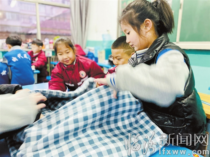 日前,临汾时代风华特色学校开展了劳动实践系列活动,引导学生崇尚劳动、热爱劳动。图为1月5日,该校一年级学生叠被子实践活动现场。