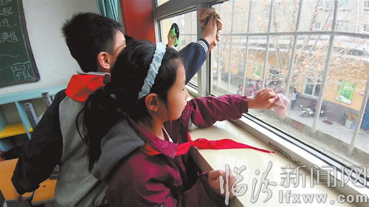 开学首日,我市部分学校组织开展了劳动实践活动,培养学生崇尚劳动、尊重劳动、热爱劳动的优良品质。图为市第三小学三(3)班学生正在认真擦玻璃。
