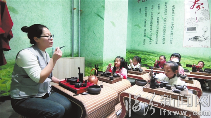 寒假期间,家长带着孩子们走进景点学习制作陶器和织布手艺等,不仅丰富了寒假生活,还传承和弘扬了中华优秀传统文化。图为孩子们在襄汾十方泽穿越小镇学习茶艺。