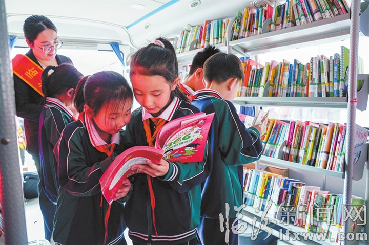 4月16日,尧都区车站街街道党工委联合市图书馆走进临汾市双语学校,开展“清正之风沐校园 廉花之香沁心田”廉洁文化进校园活动。图为该校学生在流动图书车上阅读书籍。