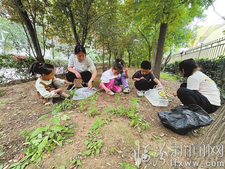 尧都区第三幼儿园小朋友到公园捡拾垃圾。