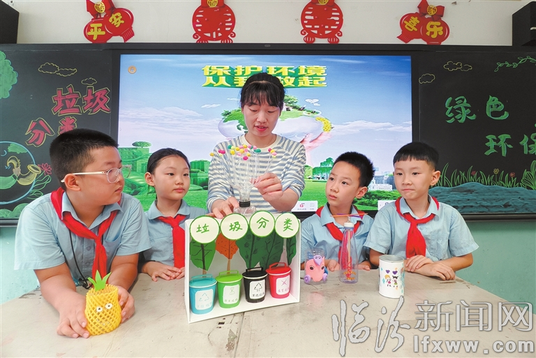 临汾新闻网讯 新学期开学后,我市各级各类学校陆续开展形式多样的“绿色环保”主题活动,进一步引导学生共建美丽临汾。图为9月2日,市第一小学教师通过手工制品,向同学们讲解垃圾分类等环保知识。