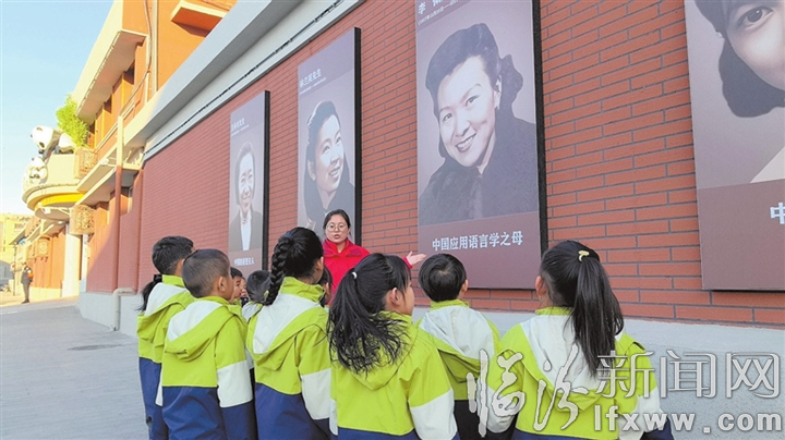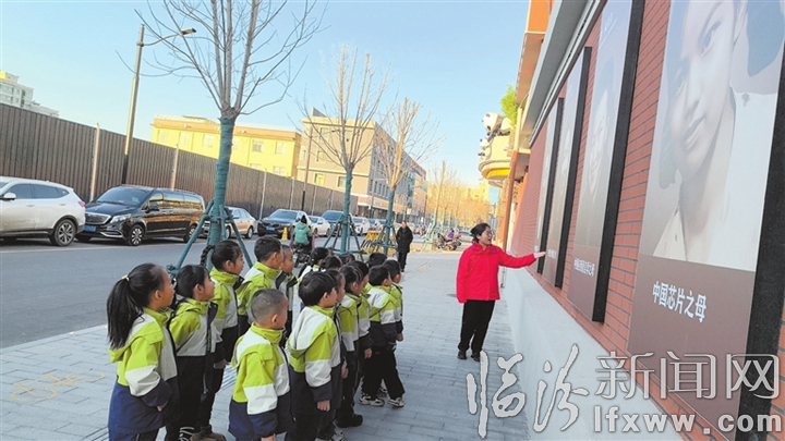 临汾新闻网讯 近日,临汾市幼儿园开展“讲好科学家故事 弘扬科学家精神”主题教育活动,让“科学家精神”的种子在幼儿心中生根发芽。图为1月6日,该园老师正在向幼儿讲述园外文化墙上悬挂的四位女科学家的故事。