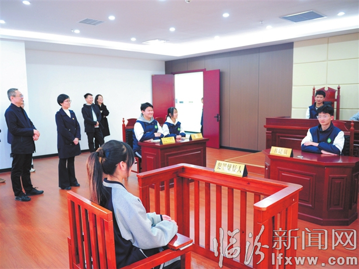 为学生正在微短剧基地的模拟法庭体验庭审流程。