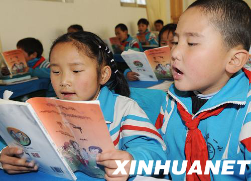 3月9日,拉萨第一小学学生格桑央吉(左)、扎拉玉杰在读藏文课本。新华社