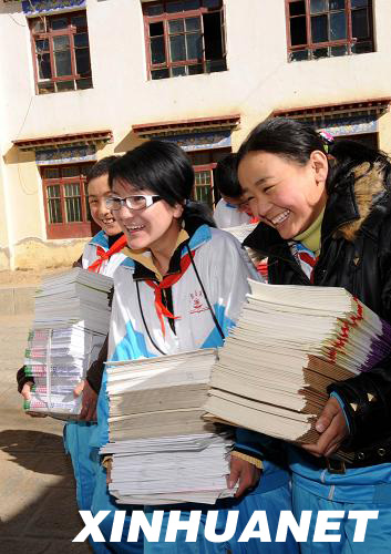 3月9日,拉萨吉崩岗小学五年级学生领到了新书。新华社